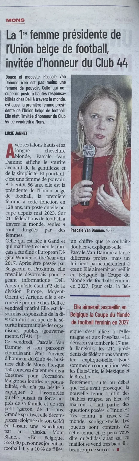 La 1re femme présidente de l’Union belge de football, invitée d’honneur du Club 44