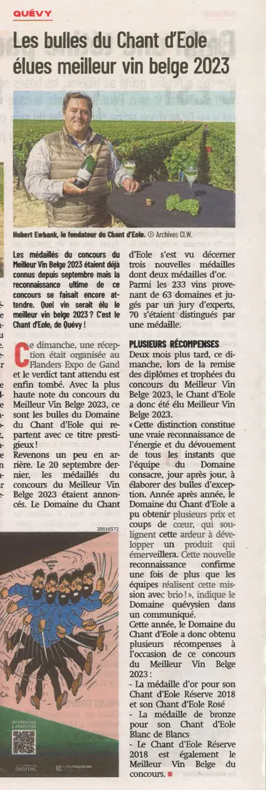 Les Bulles du Chant d’Eole élues meilleur vin belge 2023